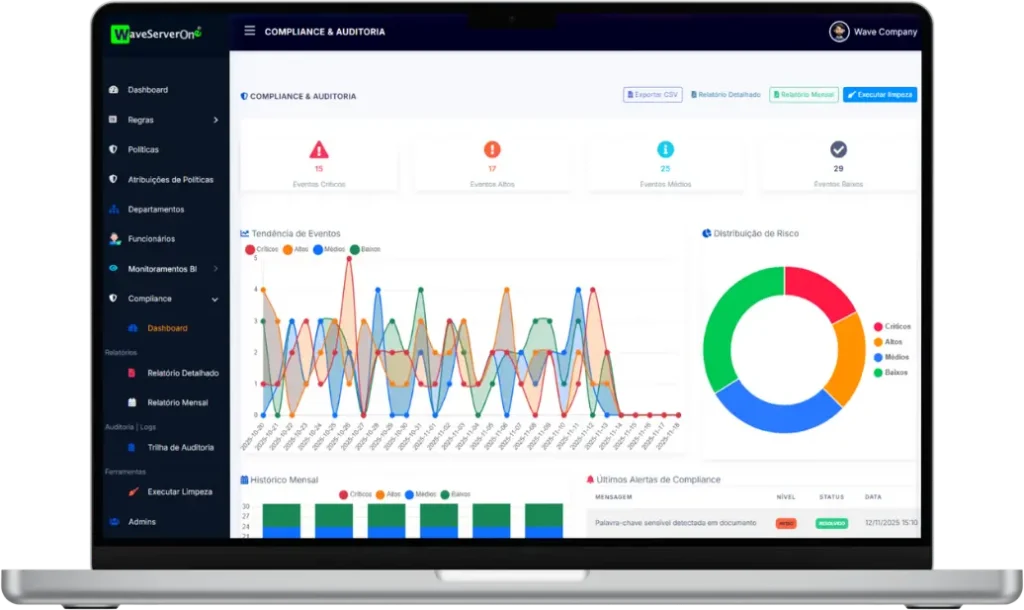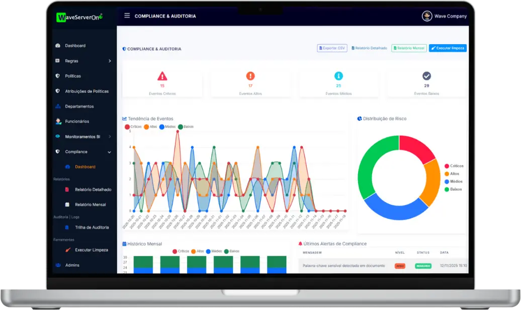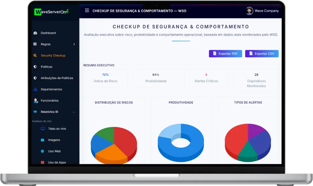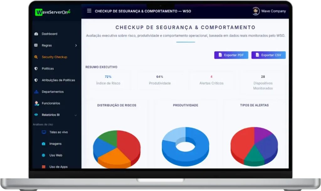 Relatórios completos sobre comportamento, produtividade, riscos internos e desvios operacionais — tudo gerado automaticamente pelo WSO.