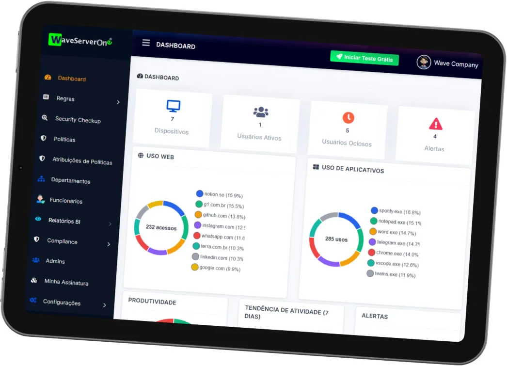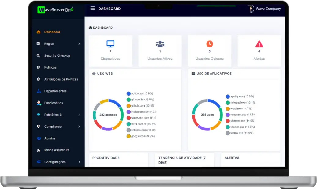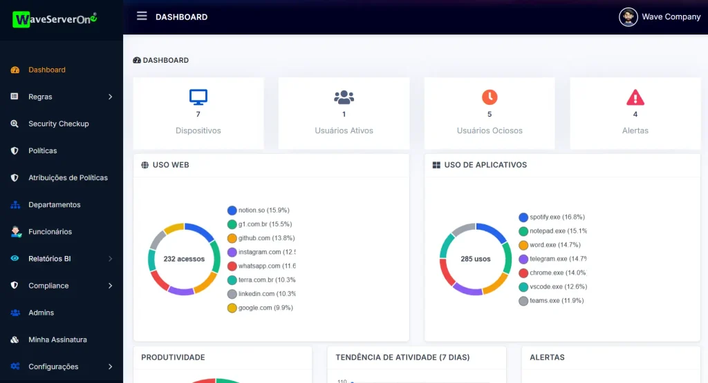Relatórios, alertas, sites, aplicativos, produtividade, riscos e comportamentos aparecem direto no painel do WSO.