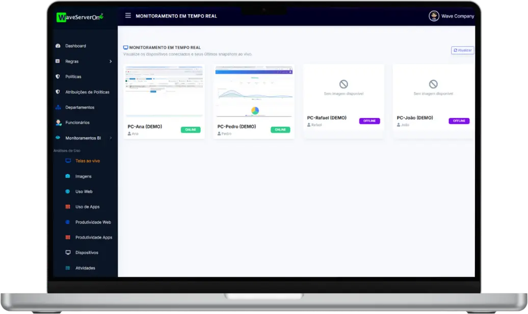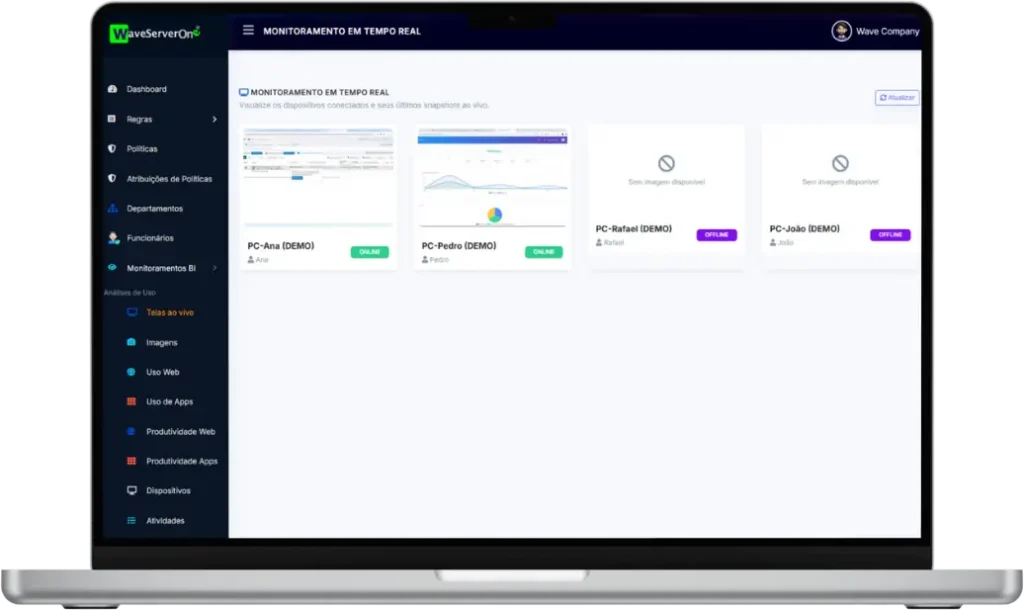 Acompanhe telas e atividades ao vivo, com precisão e total clareza.