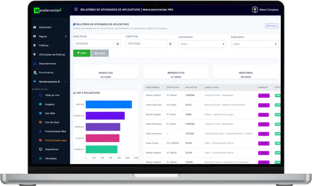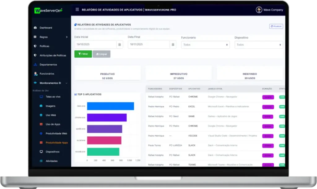 Horas produtivas, ociosas, apps críticos e gargalos da equipe em um painel pronto para decisão.