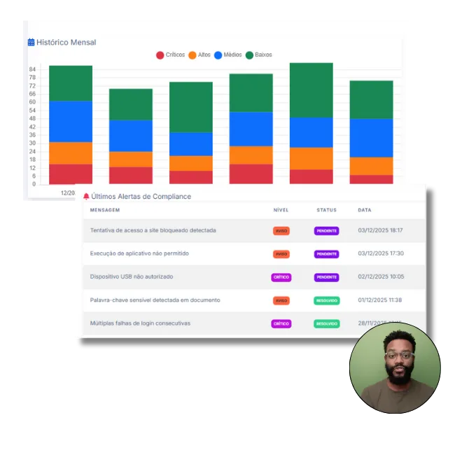 • Monitoramento em tempo real das atividades nos computadores da empresa