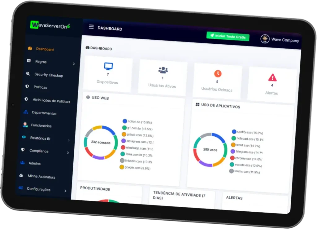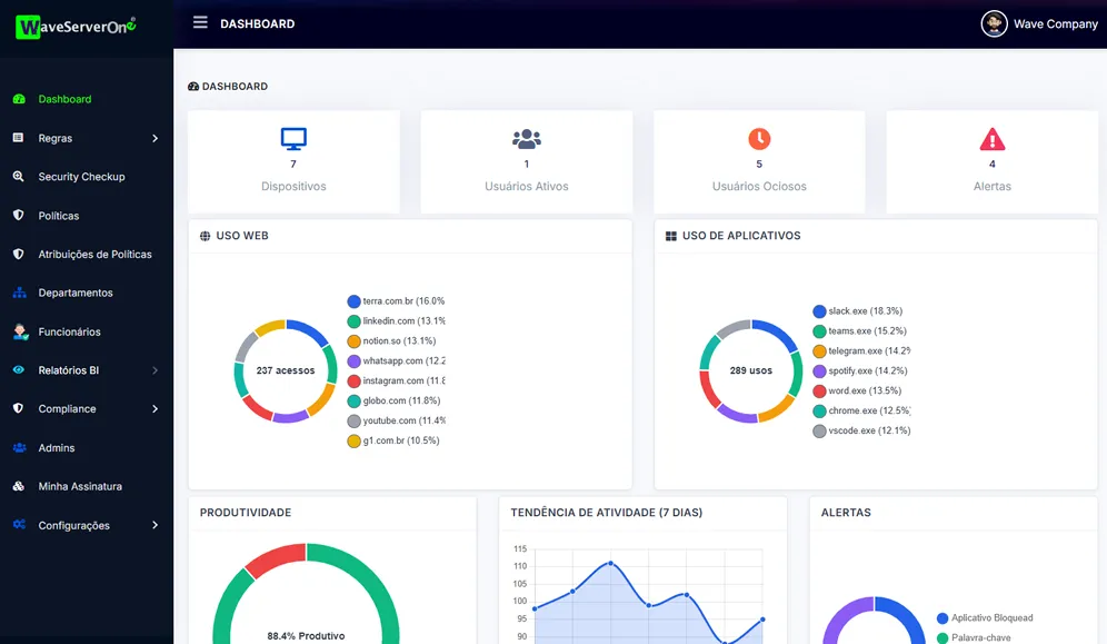 Sim. O WSO aplica políticas e monitora conformidade independentemente do local de trabalho — em casa, escritório ou modelo híbrido.